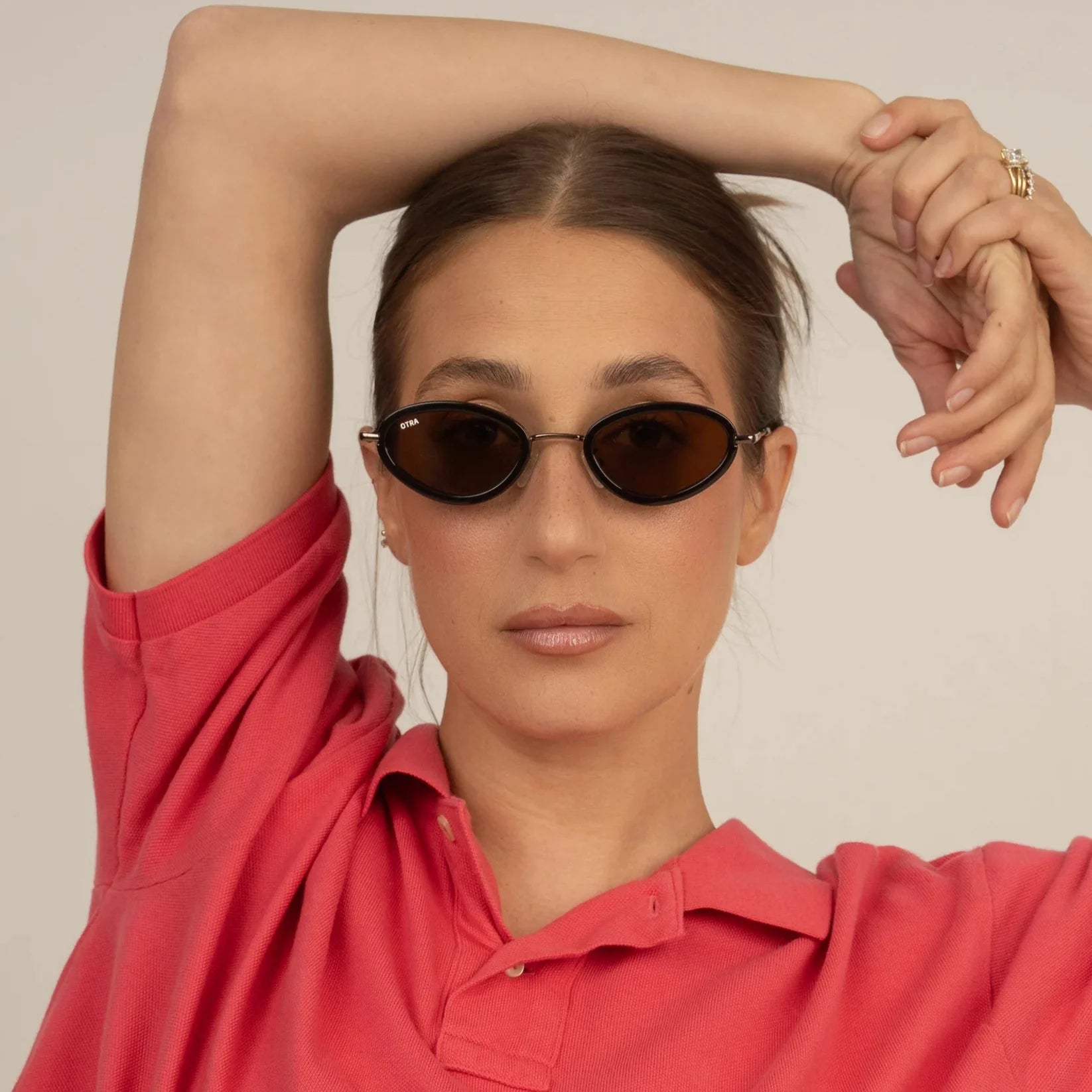 Otra Lexi - This chocolate thin oval frame combines a sleek plastic body with a subtle black metal rim for a modern, balanced look. Paired with smoke or brown lenses, it offers a bold yet refined aesthetic, perfect for effortless everyday style.